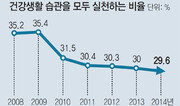 대기업 직장인 이모 씨(37)는 잦은 야근과 술자리에도 특별한 건강 문제를 겪고 있지 않는 ‘건강 체질’이다. 담배도 하루 반 갑 정도 피우고, 운동은 따로 하지 않는다. 그는 “특별히 아픈 데가 없어 생활습관을 바꾸지 않고 있다”며 “매년 정기 건강검진을 받을 때마다 의사가 비만이라며 ‘금연, 절주, 꾸준한 걷기 같은 기본 건강생활 습관이라도 실천하라’고 지적한다”고 말했다. 국내 성인 중 △금연 △저위험 음주(주 2회 미만으로 한 번 술을 마실 때 남자는 7잔, 여자는 5잔 이하로 마시는 경우) △꾸준한 걷기(최근 1주일 동안 매일 30분 이상 걷기를 주 5일 이상 실천한 경우) 등 이른바 ‘3대 기본 건강생활 습관’을 모두 실천하고 있는 사람은 3명 중 1명에 불과한 것으로 나타났다. 7일 질병관리본부가 전국 22만 명의 성인을 대상으로 조사한 ‘2014년 지역사회 건강조사 결과’에 따르면 전체 조사 대상자 중 29.6%만이 3가지 건강생활 습관을 모두 실천하고 있었다. 연령대별로는 30대와 40대의 실천 비율이 각각 23.8%와 25%로 가장 낮았다. 특히 30대와 40대 남성의 실천 비율은 각각 15.9%와 14.3%에 그쳤다. 오상우 동국대 일산병원 가정의학과 교수는 “30, 40대의 경우 가장 바쁘게 직장생활을 하는 연령대이면서 심각한 만성질환이 발생하기에는 상대적으로 이른 시기이기 때문에 건강관리에 더욱 소홀할 수 있다”며 “이들이 50, 60대가 돼서 본격적으로 고혈압 당뇨병 등 만성질환으로 고생하는 것을 막도록 건강관리 교육이 필요하다”고 말했다. 지역별로는 서울(39.2%), 대전(34.5%), 인천(33.6%)의 3대 건강생활 습관 실천 비율이 상대적으로 높았고, 제주(21.3%), 경남(21.5%), 경북(22.2%)이 낮았다. 주요 건강 습관 지표인 △남자 현재 흡연율 △고위험 음주율(주 2회 이상, 한 번 술을 마실 때 남자는 7잔, 여자는 5잔 이상 마시는 경우) △걷기 실천율 △비만율 등은 대부분 첫 조사가 진행됐던 2008년에 비해 특별히 개선되지 않았다.남자 현재 흡연율의 경우 2008년 49.2%에서 지난해에는 45.3%로 개선됐지만 △고위험 음주율(2008년 18.4%→2014년 18.7%) △걷기 실천율(50.6%→37.5%) △비만율(21.6%→25.3%) 등은 모두 악화됐다. 특히 흡연율과 고위험 음주율의 경우 상대적으로 소득 수준이 떨어지는 지역에서 더 높게 나타났다. 오 교수는 “전반적인 직장문화와 사회 분위기가 건강관리에 신경을 쓰는 데 여의치 않다는 것을 보여주는 결과”라며 “어린이와 청소년 시기부터 운동과 적절한 식생활 등 체계적인 건강관리를 습관화해야 한다”고 말했다.세종=이세형 기자 turtle@donga.com}