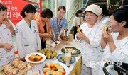서울 관악구 에이치플러스 양지병원이 20일 오전 2층 로비에서 암 예방 쿠킹레시피 추천 행사를 열어 환자들에게 비빔국수, 호밀 베이글 샌드위치, 파프리카 찜 등 암 예방에 좋은 음식을 소개하고 있다. 양회성 기자 yohan@donga.com}