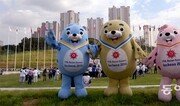 인천 아시아경기 선수촌이 26일 공개됐다. 인천 아시아경기 마스코트 ‘바라메’ ‘비추온’ ‘추므로’(왼쪽부터)가 선수촌을 배경으로 인사하고 있다. 이 마스코트들은 서해 백령도 물범을 형상화했다. ‘바라메’는 축제의 바람이 일어나라는 뜻을 담고 있으며 ‘비추온’은 세상에 희망의 빛을 비추고, ‘추므로’는 신명 나게 춤을 추자는 뜻을 담고 있다. 인천=양회성 기자 yohan@donga.com}