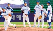 인천 아시아경기 야구 국가대표팀 투수들이 16일 서울 잠실구장에서 처음 모여 몸을 풀었다. 류중일 대표팀 감독은 첫 경기인 태국전 선발 투수를 묻는 질문에 “지금 공개하면 재미없지 않으냐. 18일 LG와의 연습 경기를 지켜본 뒤 기회가 되면 예고하겠다. 태국전 선발이 결승전 선발”이라고 답했다. 홍성무, 봉중근, 김광현, 이재학(뒷줄 왼쪽부터)이 한현희(앞)의 연습 장면을 지켜보고 있다. 양회성 기자 yohan@donga.com}