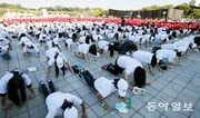 대한적십자사가 서울 송파구 올림픽공원 평화의 광장에서 20일 개최한 ‘제2회 청소년 푸시 업 러브 업’ 대회에 참여한 청소년 3000여 명이 팔굽혀펴기 30회에 도전하고 있다. 팔굽혀펴기 1회를 1000원으로 환산해 후원 기업들이 낸 기부금과 참여자들의 참가비가 이날 행사에서 모여 어려운 이웃에게 지원된다. 양회성 기자 yohan@donga.com}