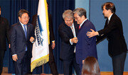 4대 그룹 총수를 포함한 기업인 128명은 15일 청와대 영빈관에서 열린 ‘2019 기업인과의 대화’에 전세버스로 이동하기 위해 이날 오전 서울 중구 대한상공회의소에 모였다. 주요 그룹 총수 등 기업인들이 한데 모여 버스를 타고 청와대로 이동하는 장면을 본 재계에서는 “좀처럼 전례를 찾아보기 힘든 장면”이라는 반응이었다. 정의선 현대자동차 수석부회장을 시작으로 재계 총수들이 속속 모습을 드러냈다. 기업인들은 각자 점심을 해결한 뒤 대한상의에 집결했다. 버스 4대에 나눠 탄 기업인들은 영빈관에 도착해 장관, 청와대 참모들과 인사를 나눴다. 청와대 관계자는 “대규모 인원이 참석하는 행사의 경우 보안, 검색 등의 이유로 버스를 이용하는 경우가 대부분”이라고 말했다. 지난해 9월 평양 남북 정상회담 당시에도 경제계를 포함한 각계 인사들은 버스로 이동한 바 있다. 사회를 맡은 박용만 대한상공회의소 회장은 “오늘 미팅의 분위기를 살리기 위해 상의를 탈의하고 진행하면 어떨까 건의드려 보겠다”고 말했고 참석자들 사이에서 웃음이 나오기도 했다. 문 대통령도 웃으면서 “좋습니다”라고 답하자 일부 여성 참석자를 제외하고선 모두 상의를 벗어 의자에 걸었다. 행사를 마친 기업인들은 다시 버스를 타고 집결지인 대한상의로 돌아갔다. 청와대는 “참석자들에게는 추후 선물로 문 대통령의 서명이 새겨진 시계를 전달할 것”이라고 밝혔다. 배석준 eulius@donga.com·한상준 기자}