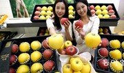 롯데마트는 18일 서울 중구 청파로 서울역점에서 노란색을 띠는 ‘황금사과’가 포함된 사과 선물세트를 선보였다. 황금사과는 기존 사과보다 수분이 많아 식감이 아삭하고 새콤달콤한 맛이 강하다. 세트 가격은 6만9000원이다. 김재명 기자 base@donga.com}