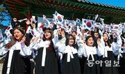 26일 서울 용산구 효창공원에서 열린 3·1절 97주년 기념 ‘기미년 3월 1일 정오’ 행사에서 보훈단체 관계자와 학생, 주민 등 500여 명이 태극기를 들고 만세 삼창을 하고 있다. 효창공원에는 백범 김구 선생을 비롯해 윤봉길 이봉창 의사 등 독립운동가들의 유해가 안장돼 있다. 김재명 기자 base@donga.com}