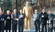 11일 서울 성북구 화랑로 한국과학기술연구원(KIST)에서 고 박정희 전 대통령 동상 제막식이 열렸다. 이 동상은 윤종용 전 국가지식재산위원장(동상 왼쪽)이 기부한 3억 원으로 제작됐다. 당초 제막식은 지난달 4일 KIST 설립 50주년 행사 때 진행될 예정이었지만 특정 인물을 우상화해 정치적으로 이용한다는 비판이 일자 연기됐다. 김재명 기자 base@donga.com}