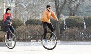흔히 생각했던 그런 작은 외발자전거가 아니었다. 수레를 밀듯 커다란 바퀴를 밀고 왔다. 바퀴 지름만 36인치(91.4cm). 바로 세우니 안장이 가슴 높이까지 왔다. 저걸 어떻게 올라타나 싶었다. 앞으로 밀면서 뛰어가더니 한쪽 발을 페달에 먼저 올린 뒤 몸을 솟구쳐 안장에 실었다. 허리를 꼿꼿이 세운 모습이 우람해 보였다.김경수 씨(41)는 이 자전거를 타고 장거리 투어에 나선다. 장거리용은 바퀴가 크다. 지난해 5월에는 빗속을 뚫고 2박 3일간 서울 동작구 사당동 지하철역을 출발해 부산 해운대 앞바다 모래사장까지 493km를 달린 데 이어 8월에는 3박 4일간 전남 해남군 땅끝마을에서 경기 파주시 문산읍 임진각까지 550km를 종주했다. 올해 5월에는 해운대에서 강원 고성군 통일전망대까지 약 500km를 달릴 계획이다.지난해 울산에서 해운대로 가던 길. 비는 오는데 바람은 거세고 국도 7호선 옆 바다에서는 일제히 일어난 흰 파도가 장관이었다. 하지만 그는 바닥난 체력으로 고전하고 있었다. 포기하려 했지만 함께 출발했던 정현욱(16) 김태권 군(16)이 그를 말렸다. 당시 중학생이던 이들은 동호회에서 만난 사이.외발자전거에는 브레이크가 없기 때문에 내리막에서 속도를 줄일 때도 다리 힘만으로 바퀴의 속도를 제어해야 한다. 속도를 제어하기 어려우니 속도를 내기도 어렵다. 이들은 “시속 35km 이상 달리면 스스로 멈칫한다”고 했다. 외발자전거 장거리 투어에서는 남자의 급소 부분에도 신경이 많이 쓰인다. 그곳에 힘을 많이 주기 때문이다. 그러나 허리에 힘을 많이 주기에 허리가 강해지고 좌우 균형을 맞추느라 머리를 많이 쓰기 때문에 두뇌활동에 좋다고 예찬론을 폈다. 김 씨가 초등학생들에게 외발자전거를 권하는 이유다. 김 씨는 어떤 사람이 산에서 외발자전거를 타는 모습을 보고 시작했다. 색다른 일을 한다는 느낌과 호기심이 원동력이었다. 다니던 회사를 그만두고 현재 외발자전거 전문강사로 활동하고 있다. 장거리 투어를 하는 이유는 전국의 사람들에게 외발자전거를 보여주기 위해서라고. “혼자 하면 균형 잡기가 어려우니 가까운 동호회를 찾아 시작하라”며 외발자전거를 권유하는 일도 잊지 않았다. 이원홍 기자 bluesky@donga.com▲동영상=36인치 외바퀴로 전국 한바퀴}