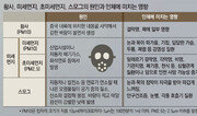 ‘미세먼지에 황사까지.’ 29일 서울, 강원, 전북 등 전국 곳곳의 일부 지역 하늘은 하루 종일 연기가 낀 것처럼 뿌옇게 보였다. 미세먼지에 중국발 황사까지 찾아왔기 때문이다. 전날 중국 베이징에는 올해 첫 황사경보가 발령됐다. 누렇고 뿌연 흙먼지가 대기에 가득 차 앞이 보이지 않을 정도였다. 이번 중국 황사는 다행히 우리나라에 큰 영향을 주지는 않았다. 기상청은 29일 “고비사막과 중국 내몽골 고원에서 발원한 황사가 대부분 중국 북동지방으로 빠져나갔고, 일부가 약하게 영향을 미쳤다”고 밝혔다. 황사와 미세먼지, 초미세먼지(PM2.5), 스모그 등 대기 질을 악화시키는 현상이 종잡을 수 없이 나타나면서 시민들은 대기가 뿌옇게 변하면 무조건 ‘미세먼지가 심한 날’로 오해하기 쉽다. 하지만 네 현상의 원인과 건강에 미치는 영향은 조금씩 다르다. 황사는 중국 내륙에 위치한 내몽골 사막에서 강한 바람으로 인해 자연적으로 만들어진 흙먼지를 말한다. 황사 입자는 칼륨과 철분 등 토양성분으로 이뤄져 있다. 입자 크기는 1∼1000μm(마이크로미터·1μm는 100만분의 1m)이지만 공중에 떠다닐 수 있는 직경 10μm 정도의 입자만 우리나라에서 관측된다. 황사는 결막염을 유발하기 쉽다. 다만 입자가 큰 만큼 코털에서 걸러져 미세먼지보다 호흡기에는 덜 나쁠 수 있다. 미세먼지와 초미세먼지는 산업시설이나 자동차 배기가스, 화석연료 등에서 발생하는 인공 오염물질이다. 중금속과 유해화학물질이 들어 있어 인체에 해롭다. 고등어나 고기를 구울 때도 다량의 초미세먼지가 나온다. 사람 머리카락 직경의 30분의 1 수준인 초미세먼지는 기도에서 걸러지지 않고 폐 깊숙이 침투해 미세먼지보다 더 해롭다. 미세먼지에 오래 노출되면 먼지를 내보내기 위해 기침이 잦아지고, 폐렴 등 감염성 질환의 발병률이 높아진다. 특히 초미세먼지가 우리 몸속으로 들어오면 면역세포가 먼지를 제거하기 위해 염증 반응을 일으킨다. 이 과정에서 알레르기성 결막염이나 비염, 천식 등이 생기기 쉽다. 노인과 유아, 임산부나 만성 폐질환, 심장질환을 가진 사람은 미세먼지에 더 취약하다. 스모그는 광범위한 대기오염 상태를 말한다. 미세먼지와 기체상에 있는 대기오염물질이 결합해 나타난다. 스모그에 노출되면 눈과 목의 점막이 자극을 받아 따갑게 느껴질 수 있다. 안구건조증과 눈병, 각종 호흡기 질환을 유발한다. 이세원 서울아산병원 호흡기내과 교수는 “최근 역학조사에 따르면 미세먼지 농도가 m³당 10μg 증가하면 전체 사망 위험은 4% 증가하고, 심혈관계 사망은 6%, 암으로 인한 사망은 8% 증가한다”고 말했다.김하경 기자 whatsup@donga.com·이진한 의학전문기자·의사}