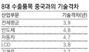 우리나라 8대 주력 수출품목의 경쟁력이 중국보다 4년도 채 앞서지 못했다는 조사결과가 나왔다. 전국경제인연합회가 20일 삼성경제연구소와 산업연구원 등 20개 민간·국책연구소 경제전문가들을 대상으로 설문조사한 결과, 한국 8대 수출품목의 대(對)중국 기술격차가 평균 3.9년에 그치는 것으로 나타났다. 8대 주력 수출품목(수출액 순)은 선박, 반도체, 무선통신기기, 화학, 기계류, 자동차, 액정표시장치(LCD), 철강 등이다. 이들 품목의 지난해 수출액은 2327억 달러로, 우리나라 총 수출액(3638억 달러)의 64.0%를 차지했다. 반도체가 4.8년, 자동차가 4.7년이었을 뿐 나머지 품목은 기술력 격차가 4년 미만에 그쳤다(표 참조). 전문가들은 이들 수출품목의 세계 경쟁력도 10점 만점 기준으로 현재의 8.5점에서 5년 뒤 8.2점으로 떨어질 것으로 내다봤다. 품목별로는 자동차(7.5→7.8점)와 기계류(7.1→7.3점)를 제외한 6개 업종의 경쟁력이 점차 약화될 것으로 평가됐다. 특히 선박은 현재 9.7점에서 5년 뒤 8.7점으로 경쟁력이 급속하게 떨어질 것으로 우려됐다. 중국 조선산업이 중국 정부의 지원에 힘입어 세계시장 점유율을 빠른 속도로 잠식하고 있기 때문이다. 우리나라 주력 수출품목이 도약할 수 있는 기회요인에 대해서는 전문가 중 40.9%가 ‘기술과 품질 우위’라고 답했다. 이어 ‘세계 경기 회복과 신흥국 성장에 따른 세계 시장 확대’(22.4%), ‘선진국 대비 우수한 가격경쟁력’(21.8%)을 꼽았다. 김현지 기자 nuk@donga.com}