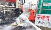 17일 전남 영광군 서해안고속도로 영광나들목 진출입로인 영흥교차로에서 방역요원들이 가축사료 운반 차량을 소독하고 있다. 12일과 14일 전북 김제시와 고창군의 농장에서 구제역이 잇따라 확인되면서 다른 지역으로의 확산을 막기 위한 방역작업이 한창이다. 영광=박영철 기자 skyblue@donga.com}