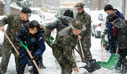 남부지방에 한파와 함께 폭설이 계속된 19일 빙판길 사고를 예방하기 위해 광주 북구 용봉동 주변도로 눈 치우기 작업에 나선 주민들과 군인, 동주민센터 직원들이 제설작업을 하고 있다. 박영철 기자 skyblue@donga.com}