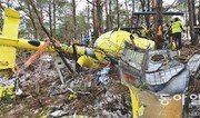 지난달 30일 산불진화용 헬기가 추락한 전북 김제시 금산면 금산사 인근 모악산에서 119 구급대원, 경찰들이 현장을 수습하고 있다. 이 사고로 조종사 김모 씨(61)가 숨졌다.김제=박영철 기자 skyblue@donga.com}