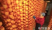 16일 전남 장성군 북하면 대봉농장에서 농민들이 곶감을 만들기 위해 감을 매달아 말리고 있다. 장성=박영철 기자 skyblue@donga.com}