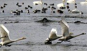 22일 전남 강진군 강진만에서 고니 떼가 해수면을 박차며 날아오르고 있다. 고니 떼가 힘차게 비상하는 장면은 이 지역 겨울 볼거리 중 하나다. 천연기념물인 고니는 시베리아 알래스카 등에서 살다가 추위를 피해 따뜻한 낙동강이나 강진만 등지로 찾아온다. 강진=박영철 기자 skyblue@donga.com}
