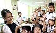 여름방학을 마치고 17일 개학한 서울 용산구 신광초등학교에서 3학년 학생들이 방학 동안 키가 얼마나 자랐는지 견주어 보고 있다. 김재명 기자 base@donga.com}
