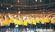 22일 서울 송파구 올림픽체조경기장에서 열린 ‘제8차 전국 적십자봉사원 대축제’에 참가한 봉사자들이 나눔과 희망의 메시지를 담은 종이비행기를 날리고 있다. 5년마다 열리는 이번 행사에는 전국에서 온 봉사자 1만1000여 명이 참가했다. 김재명 기자 base@donga.com}