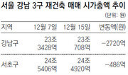 다주택자 양도소득세 중과 폐지와 투기과열지구 해제 등이 담긴 12·7대책이 발표됐지만 서울 강남·서초·송파구 등 3개 지역 재건축 아파트 값은 오히려 떨어진 것으로 나타났다. 18일 부동산정보업체 부동산써브가 강남 3개 구의 재건축 아파트 6만2420채의 시가총액 변화를 분석한 결과 12·7대책 발표 직전(62조1243억 원)보다 2260억 원 줄어든 61조8983억 원이었다. 이 가운데 강남구는 12·7대책 발표 직전 23조3428억 원에서 현재 23조708억 원으로 2720억 원 감소했다. 서초구 역시 24조5406억 원에서 24조4920억 원으로 486억 원 줄었다. 반면 송파구는 14조3355억 원으로 대책 발표 직전(14조2409억 원)보다 946억 원가량 늘어났다. 이처럼 강남·서초구와 송파구에서 희비가 엇갈린 이유는 서울시가 송파구에 있는 가락시영아파트에 대해 종을 상향해서 재건축을 허가한 것이 결적정인 원인으로 풀이된다. 박정욱 부동산써브 연구원은 “12·7대책으로 기대심리가 높아졌지만 매매시장이 비수기인 데다 양도세 중과 폐지 등 법 개정이 필요한 내용이 남아 있어 본격적인 매매가 이뤄지지는 않고 있다”면서 “정부가 의도한 대로 내년 초 부동산 시장이 살아날지는 좀 더 지켜봐야 할 것이다”라고 말했다.구가인 기자 comedy9@donga.com}