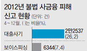 # 경기 군포시에 사는 A 씨는 보험에 가입하면 저금리로 대출을 받을 수 있다는 전화를 받았다. 그는 상담원의 말만 듣고 신분증 등 대출 관련 서류를 팩스로 보냈다. 상담원은 보증보험료 등 대출 진행 비용으로 6차례에 걸쳐 201만 원을 받아갔다. A 씨는 돈을 보낸 후 상담원에게 여러 차례 전화했으나 연락이 되지 않았다. # 시장에서 반찬가게를 하는 B 씨는 급하게 돈이 필요해 대부업체로부터 500만 원을 빌렸다. 수수료로 30만 원을 떼고 470만 원을 받았다. 이를 65일간 매일 10만 원씩 갚기로 했다. 장사가 잘 되지 않아 돈을 갚지 못하게 된 B 씨는 결국 가게를 넘기고 식당일을 나가고 있다. 이후에도 대부업체는 남은 빚을 갚으라며 그를 협박했다. 이는 대출 사기, 고금리 대출 등 대표적인 불법 사금융 피해 사례들이다. 12일 금융감독원에 따르면 지난해 4∼12월 불법사금융 피해신고센터에서 접수한 상담 및 피해신고가 8만5965건이나 되고, 피해액도 1081억 원으로 조사됐다. 유형별로는 대출 사기가 2만2537건(26.2%)으로 가장 많았고 보이스피싱 6344건(7.4%), 고금리 6293건(7.3%), 불법 채권추심 4176건(4.9%) 순이었다. 지역별로는 서울 경기 인천 등 수도권 비중이 54.5%로 절반을 넘었다. 부산 대구 대전 울산 광주 등 5개 광역시는 20.7%였다. 이는 근로자와 자영업자가 많은 대도시에서 사금융 이용이 활발했기 때문으로 풀이된다. 실제로 금감원이 지난해 상반기(1∼6월) 실시한 대부업 실태 조사에서 대부업 전체 거래자(250만 명) 중 96.9%(242만 명)가 수도권 거주자였다. 신고자는 여성보다 남성의 비율(58.5%)이 다소 높았다. 연령별로는 경제활동 인구의 주력 층인 30∼50대 비중이 83.6%로 대부분을 차지했다. 20대 신고 비율도 10.5%나 됐다. 사금융 피해 경로는 전화(56.3%)와 문자메시지(19.2%)가 전체의 75.5%였다. 금감원은 지난해 피해 신고가 많았던 52개 대부업체에 대해 특별점검을 실시해 이자율 인하, 채무조정 등을 통해 233명(2억1600만 원)을 구제했다. 조성래 금감원 서민금융지원국장은 “그동안 금융회사 직원을 파견 받아 운영해 온 불법사금융 피해신고센터(전화 1332)를 상시체제로 바꾸고 전문 상담원 12명을 채용할 예정”이라며 “강력한 불법 사금융 단속을 위해 수사기관과 협조체제를 강화하겠다”고 말했다.신수정 기자 crystal@donga.com}