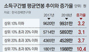 지난해 근로자 평균 연봉이 3634만 원이라는 조사결과가 나왔다. 연봉이 6950만 원을 넘으면 상위 10%에 해당되는 것으로 나타났다. 전국경제인연합회 산하 한국경제연구원은 고용노동부 ‘고용형태별 근로실태조사’의 근로자 1544만 명 자료를 분석해 22일 이같이 밝혔다. 한경연에 따르면 지난해 근로자 평균연봉은 3634만 원으로 2017년(3475만 원)보다 4.6% 올랐다. 상위 10%(10분위)의 연봉 하한선은 6950만 원으로 집계됐다. 연봉 1억 원 이상은 49만 명으로 전체 근로자의 3.2%를 차지했다. 고소득 그룹인 상위 10∼20%(9분위)의 평균연봉 하한선은 5062만 원, 20∼30%(8분위)는 4064만 원, 30∼40%(7분위)는 3380만 원인 것으로 나타났다. 저소득 그룹인 70∼80%(3분위)는 1988만 원, 80∼90%(2분위)는 1562만 원, 하위 10%는 689만 원이었다. 평균연봉 상승률은 중하위 그룹이 상대적으로 높은 것으로 나타났다. 지난해 소득 3분위 그룹의 평균연봉은 2017년에 비해 10.4%로 가장 많이 올랐다. 또 소득 2분위와 소득 4분위의 임금상승률은 각각 10.3%와 7.0%로 상대적으로 높았다. 반면 소득 상위 30%의 임금상승률은 3%대에 그쳤다. 한경연 관계자는 “최저임금 인상 등 문재인 정부 고용 정책의 영향으로 저소득 임금근로자의 연봉은 올랐다”며 “하지만 비고용 상태인 저소득층까지 포함된 통계는 아니라 저소득층 전체의 경제사정이 나아졌다고 볼 수는 없다”고 설명했다. 지난해 대기업과 중소기업의 정규직 간 임금격차도 줄어들었다. 대기업의 정규직 근로자 평균연봉은 6487만 원으로 2017년보다 27만 원(0.4%) 늘었다. 반면 중소기업은 3771만 원으로 전년보다 176만 원(4.9%) 상승했다. 이에 따라 대기업 정규직 대비 중소기업 정규직의 평균임금 비율은 2017년 55.7%에서 지난해 58.1%로 높아졌다. 한경연 추광호 일자리전략실장은 “지난해 경제성장률(2.7%)은 2017년(3.2%)보다 낮아졌지만, 평균연봉 인상률은 전년보다 2.4%포인트 상승한 4.6%를 기록했다”며 “제조업의 노동생산성 증가율은 감소한 반면 단위노동비용 증가율은 늘어나고 있어 생산성을 고려한 임금인상이 이뤄져야 한다”고 지적했다.유근형 기자 noel@donga.com}
