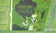 충북 괴산의 명물인 ‘논 그림’이 선명한 모습을 드러내고 있다. 괴산군은 사리면 백마저수지 인근 8000m²의 논에 유색 벼를 심어 만든 이 논 그림은 만화 캐릭터인 ‘톰과 제리’를 활용해 2022년 열리는 ‘괴산세계유기농엑스포’를 알리고 있다. 장기우 기자 straw825@donga.com}