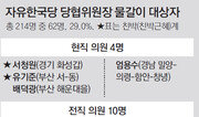 자유한국당이 내년 지방선거를 앞둔 조직 혁신 차원에서 전국 253곳 중 호남을 제외한 214곳에 대한 당무감사를 벌여 당협위원장의 30% 가까운 62명(29%)의 자격을 박탈했다. 친박(친박근혜)계 핵심인 서청원 유기준 의원 등 현역 4명은 당협위원장 자격을 잃었고, 수도권에 지역구를 둔 친박계 중진을 포함한 의원 16명은 더 분발하라는 취지의 경고를 받았다. 한국당 홍문표 사무총장과 이용구 당무감사위원장은 17일 당사에서 당무감사 결과 기준점을 미달한 당협위원장 교체 지역을 발표했다. 물갈이 대상인 현역은 서, 유 의원 외에도 ‘엘시티 비리’ 관련 수뢰 혐의로 수감 중인 배덕광 의원, 최근 정치자금법 위반 혐의로 기소돼 재판을 받고 있는 엄용수 의원이 포함됐다. 원외 당협위원장은 전직 의원 10명과 류여해 최고위원(서울 서초갑) 등 모두 58명이다. 박근혜 전 대통령을 제명하고, 서청원 최경환 의원에게 자진 탈당을 권고한 한국당은 내년 지방선거에 대비해 ‘친박 지우기’ 마무리에 나선 것으로 분석된다. 박근혜 정부에서 주중 대사를 지낸 권영세(서울 영등포을), 여성가족부 장관을 지낸 김희정(부산 연제), 친박으로 분류되는 박창식(경기 구리) 손범규(경기 고양갑) 신동우(서울 강동) 전하진(경기 성남 분당을) 등 전직 의원 10명도 탈락했다. 여기엔 박민식(부산 북-강서갑) 등 몇몇 비박 측 전직 의원들도 포함됐다. 하지만 친박 측에선 ‘찍어내기식 표적 감사’라고 반발하고 있다. 서 의원은 “허허, 고얀 짓이네. 못된 것만 배웠구먼. 당의 앞날이 걱정이네”라고 말했다고 서 의원 측 인사가 전했다. 유 의원은 통화에서 “왜 이렇게 나왔는지 확인 중에 있다. 뭐라 할 말이 없다”고 말했다. 홍준표 대표는 발표 직전 페이스북에 “옥석을 가리지 않으면 지방선거를 치를 수 없기에 부득이하게 당협위원장 정비를 하게 됐다. 일체의 정무판단 없이 계량화된 수치로 엄격히 블라인드로 결정했다”고 적었다. 당무감사는 100점 만점에 1권역 및 현역 의원은 55점 미만, 2권역은 50점 미만을 커트라인으로 정했다. 1권역은 영남 전역과 서울 강남3구, 성남 분당 지역이다. 1권역과 호남 지역을 제외한 기타 전 지역이 2권역이다. 당초 커트라인을 현역은 원외보다 5점 더 높이자는 의견이 제시됐다. 그러나 시뮬레이션 결과 현역 박탈 대상자가 20명으로 늘어나면서 집단 탈당 등 후유증을 우려해 기준을 낮췄다고 한다. 당 관계자는 “55점은 넘었지만 60점에 미달해 경고를 받은 현역 16명 중에는 수도권 다선 중 친박계가 다수 포함됐다. 이 중에는 이번 원내대표 경선에 참가한 의원도 있다”고 전했다. 바른정당 ‘복당파’ 의원들은 희비가 엇갈렸다. 원내대표로 선출된 김성태 의원을 비롯해 강길부 김영우 여상규 이진복 정양석 홍철호 의원 등 7명은 이번에 교체된 당협위원장의 후임이 될 가능성이 높다. 반면 김무성 김용태 박순자 이종구 황영철 등 11명의 지역구는 기존 당협위원장이 그대로 자리를 지켰다. 당협위원장은 지방선거 때 구청장과 광역·기초의원 공천 시 후보 추천권을 갖는다. 앞으로 당협위원장 선출 과정에서 홍 대표의 입김이 더 세질 것으로 보인다. 홍 대표는 16일 “원래 2월 말까지 하려 했는데 당무감사 이후 당협 정비 시간이 걸리니 늦어도 3월 말까지는 (공천을) 완료하겠다”고 밝혔다. 한국당 지도부의 면면도 대폭 교체될 것으로 보인다. 이철우 의원이 내년 6·13지방선거에서 경북도지사 출마를 선언하며 최고위원직을 사퇴했다. 원외인 이재만, 이종혁 최고위원도 각각 대구시장과 부산시장 경선에 출마하기 위해 최고위원직에서 물러날 것으로 보인다. 새로 선출된 김성태 원내대표와 함진규 정책위의장이 지도부에 합류하는 것을 포함해 최고위원 9명 중 5명이 교체됐거나 곧 바뀐다. 박훈상 tigermask@donga.com·홍수영 기자}