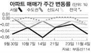 서울과 수도권에서 아파트 매매가와 전세금이 2주 연속 떨어졌다. 특히 서울에서는 거래 비수기와 10·26 재·보궐선거로 재건축에 부정적인 견해를 피력한 박원순 시장이 당선된 여파로 재건축 시장의 하락세가 두드러졌다. 4일 부동산114에 따르면 이번주 아파트 매매시세는 서울 0.05%, 신도시 0.02%, 수도권 0.02% 각각 떨어진 것으로 집계됐다. 서울에서는 재건축 아파트가 많은 강동구(―0.15%)와 송파구(―0.13%), 강남구(―0.13%)가 0.1% 이상 크게 떨어졌고, 구로구(―0.07%)와 종로구(―0.05%) 등이 뒤를 이었다. 신도시와 기타 수도권에서는 과천(―0.08%), 인천(―0.08%), 중동(―0.05%), 광명(―0.04%), 분당(―0.02%), 용인(―0.02%) 등지의 내림세가 두드러졌다. 한편 전세시장은 11월 들어 안정세가 더욱 뚜렷해지는 모습이다. 서울과 수도권 전세금은 각각 0.03%, 0.01% 떨어졌고 신도시는 가격 변동이 없었다. 구가인 기자 comedy9@donga.com}