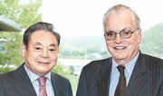 북미시장을 점검하기 위해 미국을 방문 중인 이건희 삼성전자 회장(왼쪽)이 3일 오후(현지 시간) 미국 뉴욕 주에 있는 코닝 본사를 방문해 제임스 호턴 명예회장과 협력 방안을 논의했다. 삼성과 코닝은 액정표시장치(LCD) 유리 등 다양한 부품의 개발과 생산을 위해 공조하고 있다. 삼성그룹 제공}