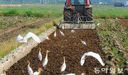모내기가 한창인 26일 전남 담양군 봉산면에서 한 무리의 황로들이 논갈이를 하는 트랙터 뒤를 따라다니며 지렁이 미꾸라지 등 먹이사냥을 하고 있다. 박영철 기자 skyblue@donga.com}