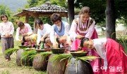 단오(6월 20일)를 앞둔 15일 광주 북구 무등산 평촌마을에서 한복을 입은 어린이들이 창포물 머리 감기 체험을 하고 있다. 창포에는 염증과 피부병을 치료하는 살균 성분이 있어 우리 조상들은 단오절마다 창포를 우려낸 물로 머리를 감거나 목욕을 했다. 광주=박영철 기자 skyblue@donga.com}