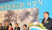 김준기 동부그룹 회장은 6일 오전 강원 춘천시 베어스호텔에서 열린 ‘제9회 동곡상 시상식’에 참석해 수상자들을 격려했다. 동곡상은 김 회장의 부친인 고 김진만 전 국회부의장이 고향인 강원지역 발전에 기여한 인재를 격려하고 기념하기 위해 만든 상이다. 올해는 △지역발전부문 박흥수 강원정보문화진흥원장 △문화예술부문 이영춘 한국문인협회 감사 △사회봉사부문 김수연 작은 도서관을 만드는 사람들 대표 △교육연구부문 유창연 강원대 농업생명대 교수 △자랑스러운 출향 강원인 부문 이기웅 열화당 대표가 수상했다. 김 회장은 인사말을 통해 “동부그룹과 함께 강원도의 경제, 사회, 문화 발전에 미력이나마 보탬이 될 수 있도록 애쓰겠다”고 밝혔다. 이날 행사에는 최문순 강원도지사, 김시성 강원도의회의장, 염동열 새누리당 의원 등 정관계와 지역 인사 200여 명이 참석했다. 한편 김 회장은 최근 동부제철 경영권을 상실하는 등 동부그룹을 경영하는 과정에서 어려움을 겪고 있다. 김 회장은 동부그룹이 경영난에 빠진 뒤 외부 행사에는 거의 모습을 드러내지 않고 있다.이세형 기자 turtle@donga.com}