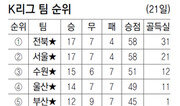 스플릿 시스템 가동을 앞두고 팀당 두 경기만 남은 K리그의 최고 관심사는 상위 리그행 막차 티켓 쟁탈전이다. 올 시즌 스플릿 시스템을 도입한 K리그는 30라운드까지의 성적으로 1∼8위와 9∼16위가 상하위로 리그를 나눠 31∼44라운드를 치른다. 어느 리그로 가느냐에 따라 대접이 크게 달라져 8위 싸움이 최고의 관전 포인트로 떠올랐다. 28라운드를 마친 21일 현재 1∼6위인 전북 서울 수원 울산 부산 포항은 상위 리그행이 확정됐다. 7위 제주도 상위 리그 진출을 사실상 결정지었다. 제주가 남은 두 경기를 모두 패하고 8, 9위인 인천이나 대구가 2연승해 승점이 같아져도 골 득실에서 제주가 크게 앞서 있다. 골 득실차에서 제주는 +14, 인천은 ―3, 대구는 ―7이다. 8∼11위인 인천 대구 경남 성남이 마지막 남은 상위 리그행 티켓 한 장을 놓고 막판 경쟁을 벌여야 한다. 나란히 승점 36을 기록 중인 인천과 대구가 상대적으로 유리한 상황이다. 승점 34인 경남이 뒤를 쫓고 있다. 승점 33의 성남은 자력으로는 상위 리그행이 불가능하다. 성남은 남은 경기를 다 이겨도 인천이나 대구가 1승 1무 이상의 성적을 내면 하위 리그로 가야 한다. 올 시즌 개막 전 우승 후보로 꼽히던 성남은 스플릿 시스템의 최대 희생양이 될 처지에 놓였다. 스플릿 시스템 도입으로 올 시즌 상위 리그에서 최종 1위를 차지하면 별도의 플레이오프를 치르지 않고 바로 우승컵을 들어올린다. 상위 리그 1, 2위 팀은 아시아축구연맹(AFC) 챔피언스리그 출전 자격을 얻는다. 3위 팀에는 AFC 챔피언스리그 출전을 위한 플레이오프에 나갈 기회가 주어진다. 반면 하위 리그에 속하면 내년 시즌부터 시작하는 승강제의 2부 리그로 떨어지는 부담을 안아야 한다. 스플릿 시스템 하위 리그의 두 팀은 2103년 시즌에 승강제의 2부 리그로 떨어진다. 한국프로축구연맹은 내년 시즌 2부 리그 강등 팀을 스플릿 시스템 하위 리그의 7, 8위(전체 15, 16위) 두 팀으로 할지, 군부대팀인 상주 상무와 스플릿 시스템 하위리그 꼴찌인 8위 팀으로 할지를 9월 열리는 이사회에서 결정하기로 했다. AFC가 클럽팀이 아닌 상주 상무에 대해 프로리그 참가 불가라는 유권해석을 내렸기 때문에 상주 상무는 AFC가 요구하는 사단법인으로 전환해야 1부든 2부든 리그 참가의 길이 열린다.이종석 기자 wing@donga.com}