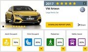 폴크스바겐의 새 모델 ‘아테온(Arteon)’이 유럽충돌시험에서 만점을 받아 우수한 안전성을 입증 받았다. 특히 BMW 5시리즈와 메르세데스벤츠 E클래스 등 프리미엄 브랜드 모델보다 높은 평가를 받는 기염을 토했다.폴크스바겐은 유럽 자동차충돌테스트 기관인 유로엔캡(Euro NCAP)이 최근 실시한 신차 안전도 평가에서 아테온이 최고 등급을 획득했다고 11일 밝혔다. 종합 평가는 별 5개를 받아 최고 점수를 받았고 각 항목별 성적도 모두 만점 기준을 넘어섰다.폴크스바겐은 “아테온에 탑재된 첨단 운전보조 시스템과 최적화된 차체 구조, 효과적인 안전벨트 등이 완벽하게 조화를 이루는 통합 안전 시스템 덕분에 좋은 점수를 받을 수 있었다”고 말했다.세부적으로는 탑승자 안전에서 96%를 받아 만점(5스타) 기준인 80%보다 월등히 높은 점수를 기록했다. 아동 안전 분야에서는 85%(만점 75% 기준)를 획득했으며 보행자 보호는 85%(만점 60%), 안전보조 장치는 82%(만점 50%)으로 모두 기준치를 뛰어넘는 우수한 성적을 받았다. 특히 탑승자 안전 항목 점수는 95%를 받은 메르세데스벤츠 E클래스보다 뛰어난 것으로 평가받았다. 또한 아동 안전 점수는 E클래스(90%)보다 낮았지만 BMW 5시리즈(85%)와 동일한 점수를 기록했고 보행자 보호와 안전보조 장치 점수는 E클래스(77%, 62%)와 5시리즈(81%, 59%)를 압도했다.테스트에 사용된 모델은 2.0리터 TDI 디젤 엔진이 탑재된(최고출력 150마력) 이그젝큐티브 트림으로 공차중량은 1625kg이다.폴크스바겐에 따르면 아테온에는 전 좌석 안전벨트 착용 알림 시스템을 비롯해 크루즈 컨트롤 시스테과 긴급 제동 장치를 포함한 프론트 어시스트 모니터링 시스템, 차선 유지보조 장치 등이 기본 적용됐다. 여기에 전면 에어백과 앞좌석, 뒷좌석 탑승자용 헤드 에어백 시스템과 앞좌석 사이드 에어백 등이 탑재됐으며 후방 충돌 시 목뼈 손상을 최소화하는 헤드레스트와 위기 상황을 감지하는 탑승자 사전 보호 시스템 등이 더해졌다.동아닷컴 김민범 기자 mbkim@donga.com}
