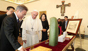 문재인 대통령과의 면담을 마친 프란치스코 교황은 별도의 공간에 대기하고 있던 문 대통령의 부인 김정숙 여사, 강경화 외교부 장관 등과 인사를 나눴다. 문 대통령 내외는 준비해온 예수님 얼굴상과 성모상 등을 프란치스코 교황에게 선물했다. 천주교 신자인 김 여사(세례명 골롬바·비둘기라는 뜻)는 검은 미사포를 머리에 쓰고 교황을 맞았다. 문 대통령은 성모상을 소개하며 “평화를 바라는 간절한 마음을 담았다”고 말했고, 교황은 “너무 아름답다”고 했다. 청와대는 “한국 조각계의 원로이자 한국 교회 조각의 현대화, 토착화에 크게 기여한 최종태 조각가의 작품”이라며 “성모 마리아는 한국 민족과 교회를 돌보는 수호성인이기도 하다”고 설명했다. 답례로 프란치스코 교황은 올리브 가지와 자신이 쓴 책을 전달했다. 교황은 “올리브 가지를 대통령께 드리고 싶다. 로마의 예술가가 평화의 염원을 담았다”고 설명했다. 이에 문 대통령은 “한국에서 번역해 놓은 교황님 책을 다 읽어봤다”며 감사를 표했다. 또 프란치스코 교황은 우리 측 수행원 모두에게 비둘기 모형과 묵주를 선물했다. 천주교에서 올리브 가지는 구원을, 비둘기는 평화를 상징한다. 앞서 프란치스코 교황은 문 대통령에게도 묵주를 선물한 바 있다. 문 대통령은 지난해 5월 취임 직후 김희중 대주교를 대통령 취임 특사로 교황청에 파견했고, 김 대주교를 만난 교황은 묵주를 문 대통령에게 선물했다. 김 대주교로부터 묵주를 선물받은 문 대통령은 “묵주까지 축성해서 선물로 주셨다는 말씀을 들었는데 2개를 주신 것은 저희 부부에게 주신 듯하다”고 말하기도 했다. 바티칸=한상준 기자 alwaysj@donga.com}