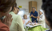 코에 영양관과 산소공급기를 주렁주렁 매단 환자들이 환하게 웃고 있다. 병상 옆에서 흰 가운을 입은 의사가 기타를 치며 노래를 부르는가 하면, 백발 환자에게 자기가 쓰는 립스틱을 발라주는 간병인이 있다. 17일 서울 종로구 ‘사진위주 류가헌’ 갤러리에선 이처럼 호스피스 병동의 일상을 담은 사진 50점이 걸렸다. 이 사진전은 보건복지부와 국립암센터가 18일 제5회 호스피스의 날 기념식을 앞두고 개최했다. 사진가 성남훈 씨(전주대 객원교수)가 인천 서구 가톨릭관동대 국제성모병원과 강원 춘천시 춘천기독의원의 호스피스병동에 100일간 머물며 찍은 사진에는 병실의 일상이 생생히 담겨 있다. 이별을 앞둔 환자와 가족, 의료진이 슬퍼하는 모습뿐 아니라 먹고 자고 웃는 모습도 그대로 보여주려 했다는 게 주최 측의 설명이다. 전시는 29일까지 계속된다. 복지부는 8월 시행된 연명의료결정법에 따라 가정에서 호스피스 서비스를 받을 수 있는 질환을 말기 암에서 후천성면역결핍증(AIDS·에이즈), 만성폐쇄성호흡기질환, 만성간경화로 넓혀 시범사업을 벌이고 있다. 가정형 호스피스 이용 환자는 하루 최소 4210원(간호사만 방문)에서 최대 1만2610원(의사·간호사·사회복지사 방문)만 내면 된다. 조건희 기자 becom@donga.com}