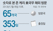 16일 베이징(1박2일)→17일 서울(1박2일)→18일 시애틀에서 5시간 보낸 후 워싱턴 귀경…. 지난 주말 중국과 한국을 ‘번개’처럼 방문해 양국 정상을 만나고 다시 미국 워싱턴 주 시애틀로 이동한 존 케리 미 국무장관의 살인적인 출장 스케줄이 화제다. 국무장관이란 자리가 ‘세계의 외교장관’이라 불리며 대통령 부통령 하원의장에 이어 미 정부 서열 4위여서 역대 국무장관들도 해외 출장이 잦은 편이었지만 케리는 역대 어느 장관보다 해외출장이 많다는 게 워싱턴 외교가의 평이다. 18일 미 국무부에 따르면 케리 장관은 2013년 2윌 취임 후 2년 3개월 동안 출장지에서 보낸 날이 장관 재직일의 40%가 넘는 353일이며 방문국은 65개국이다. 총 비행 거리는 81만 마일(130만4000km)로 지구를 32바퀴 이상 돈 셈이다. 이대로라면 재임 4년 동안 82만 마일(112개국 방문)을 비행해 해외 방문 많이 한 걸로 유명한 힐러리 클린턴 전임 국무장관기록을 훌쩍 넘어설 것으로 보인다. 지금까지 케리 장관이 비행기에서 보낸 시간만 따져도 약 1770시간으로 74일에 해당한다. 이번 달만 해도 아프리카 및 중동 출장(5월1일~8일)을 다녀온 뒤 사흘 쉬고 러시아, 터키(5월11일~13일)를 방문한 데 이어 사흘 간 워싱턴에서 업무를 본 뒤 이번 서울 방문에 나섰다. 4월에도 이란 핵협상 타결을 위해 스위스에 간 것을 비롯해 네 차례나 출국했다. 그러면서도 케리 장관은 버락 오바마 대통령이 주재하는 주요 외교안보 회의에는 대부분 참석하고 있다. 국무부 한 관계자는 “케리 장관은 젊은 직원들도 따라가기 어려울 정도로 체력이 좋다. 워낙 바빠 비서실의 가장 중요한 업무 중 하나가 장관 일정 짜는 것”이라고 전했다. 하지만 72세의 케리 장관이 아무리 베트남 전에 참전해 은성무공훈장까지 받은 강철 체력이라 해도 무리가 따를 수밖에 없다. 지난달 28일 백악관에서 열린 오바마 대통령과 아베 신조(安倍晋三) 일본 총리의 공동기자회견에 배석한 케리 장관이 피곤함을 이기지 못하고 하품을 하는 장면이 언론에 포착되기도 했다. 그는 회견 사흘 전 캐나다 출장을 다녀왔다. 출장이 잦다보니 비행기 사고도 발생하고 있다. 케리 장관은 20년 넘은 보잉 757 기종의 전용기를 타고 다니는데 지난해 10월 오스트리아 빈에서 출장을 마치고 귀국하려다 기체 결함으로 민항기를 타고오기도 했다. 민항기를 탈 경우에는 백악관과의 직통 보안 전화를 사용할 수 없어 당시 케리 장관은 비행시간 동안 업무를 못 봐 답답함을 호소했다는 후문이다. 지난해 아프가니스탄 등 위험 지역을 갈 때는 적의 공격을 피하기 위해 전용기 대신 C-130 등 군수송기 짐칸에 몸을 싣기도 했다.워싱턴=이승헌 특파원 ddr@donga.com}