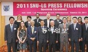 LG상남언론재단은 22일 서울대 호암교수회관에서 해외 언론인들에게 한국연수를 실시하는 ‘2011 서울대-LG 프레스 펠로십’ 개회식을 열었다. 이 프로그램은 1997년부터 매년 한 차례 열리며 올해에는 브라질 중국 인도 등 8개국 기자 8명이 참여해 3주 동안 한국의 문화와 경제, 사회를 배울 예정이다. 개회식에서 정상국 LG그룹 부사장(앞줄 왼쪽), 오연천 서울대 총장(앞줄 왼쪽에서 네 번째) 등 펠로십 관계자와 해외 언론인들(뒷줄 8명)이 기념촬영을 하고 있다. LG그룹 제공}