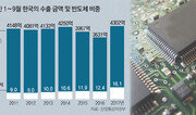 한국 경제가 반도체 슈퍼사이클(초장기 호황)을 등에 업고 수출 호조가 계속되고 있다. 하지만 반도체 단일 제품 의존도가 사상 최대 수준으로 늘어났고 약점으로 지적돼 온 중국 시장 의존도 개선될 기미는 보이지 않고 있다. 특히 수출의 온기가 좀처럼 내수로 퍼지지 않으면서 ‘취업 빙하기’가 길어질 수 있다는 우려도 나온다. 15일 산업통상자원부는 올해 1∼9월 누적 수출 금액이 4301억9000만 달러로 집계됐다고 발표했다. 이는 지난해 같은 기간보다 18.5% 증가한 수치. 1∼3분기 누적 금액 기준으로 종전 최고 기록인 2014년의 4250억 달러를 넘어선 역대 최대다. 이에 따라 2014년 이후 3년 만에 수출과 수입을 합친 교역액 1조 달러 복귀가 유력해졌다. 산업부에 따르면 올해 1∼10월 수출(4752억 달러)과 수입(3926억 달러) 금액을 합친 교역액 잠정치는 8678억 달러. 산업부는 올해 교역 규모 예상치를 1조300억 달러로 추정하고 있다. 한국의 수출 강세는 사실상 반도체가 주도했다. 반도체 수출 금액은 지난해보다 53.9% 늘어난 692억2000만 달러로 집계됐다. 2∼4위 품목군인 일반기계(362억 달러), 선박(355억 달러), 석유화학제품(336억 달러)과 차이가 크게 난다. 반도체가 전체 수출 금액에서 차지하는 비중도 16.1%로 사상 최대를 기록했다. 반도체 의존은 주식시장에서도 확인되고 있다. 15일 종가 기준 삼성전자(357조2155억 원)와 SK하이닉스(59조6962억 원), 삼성전자 우선주(40조1148억 원) 등 3개 종목이 유가증권시장 전체 시가총액(1634조9630억 원)에서 차지하는 비중은 약 28%에 이른다. 한국거래소에 따르면 삼성전자와 SK하이닉스는 올해 3분기까지 누적 영업이익 38조5000억 원과 9조3000억 원을 기록했다. 유가증권시장 상장사 525개사(금융업 제외)의 전체 누적 영업이익의 32.0%, 7.7%에 이르는 규모다. 반도체에 의존한 수출은 내수 회복에 한계가 있다고 전문가들은 지적한다. 주원 현대경제연구원 경제연구실장은 “반도체 산업은 국내 고용과 부가가치 창출에 미치는 효과가 가장 작다. 수출은 살아나는데 내수가 침체되는 디커플링(탈동조화) 현상이 일어나는 이유”라고 지적했다. 이날 통계청이 발표한 ‘10월 고용동향’에 따르면 지난달 전체 취업자 수는 전년 같은 기간보다 27만9000명 늘어나는 데 그쳤다. 전체 취업자 증가 폭이 한 달 만에 다시 20만 명대로 떨어진 것이다. 청년층(15∼29세)의 고용 한파도 계속되고 있다. 지난달 청년층 실업률은 8.6%로 10월 기준으로 1999년 이후 가장 높았다. 체감실업률은 1년 전보다 0.6%포인트 오른 21.7%로 관련 통계를 작성하기 시작한 2015년 이후 가장 높은 수준이었다. 한국 수출의 중국 의존도 좀처럼 개선되지 않고 있다. 지난해 말부터 중국은 한국을 상대로 사드(THAAD·고고도미사일방어체계) 보복을 진행해 한국 기업이 큰 피해를 봤다. 그럼에도 올해 1∼9월 전체 수출 금액의 23.6%가 중국 시장에서 이루어진 것으로 나타났다. 아세안 지역(16.5%) 및 미국(12.1%)보다 크게 앞선 수치다. 이에 대해 산업부 측은 “중국 의존도가 가장 높았던 2013년(26.1%)보다는 줄어들고 있어 개선되는 부분이 있다”고 설명했다. 세종=이건혁 gun@donga.com·박희창 / 박성민 기자}