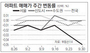 글로벌 경제위기라는 돌발변수에 부동산 경기도 크게 위축되는 모양새다. 투자목적 성격이 강한 서울 재건축 단지(―0.32%)를 중심으로 매매가 하락세가 두드러졌다. 3일 부동산정보업체 부동산114에 따르면 지난주 서울(―0.05%)의 매매가는 전주(―0.03%)보다 하락폭이 커졌다. 특히 강남(―0.20%) 송파(―0.10%) 서대문(―0.04%) 양천(―0.04%) 서초구(―0.03%) 순으로 가격이 많이 떨어졌다. 다만 서울을 제외한 수도권은 매매가 이뤄지면서 강보합세를 보이고 있다. 신도시 중 시장 분위기를 주도하는 분당(―0.01%)과 일산(―0.01%)은 약세를 면하지 못하고 있다. 반면 산본(0.09%)은 소형 아파트를 중심으로 매매가 꾸준히 이뤄지면서 오름세를 탔다. 경기 화성(0.05%) 구리(0.05%) 광명(0.04%) 안성(0.01%) 수원(0.01%) 등지도 상승세를 보였다.구가인 기자 comedy9@donga.com}