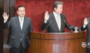 4·24 재·보궐선거에서 당선돼 국회에 진출한 새누리당 김무성, 이완구 의원과 무소속 안철수 의원이 26일 국회에 첫발을 내디뎠다. 세 의원은 오전 10시 10분 국회 본회의장 연단에 서 의원선서를 하고 의정활동에 대한 포부를 밝혔다. 5선 고지에 오른 김 의원은 “야당 의원도 자주 뵙고 소주도 한잔하고 싶다. 콜(연락)하면 응해 달라”고 말했다. 9년 만에 국회로 돌아온 이 의원(3선)은 “지역과 정파를 초월해 국민들이 바라는 바를 정치권이 해내야 한다”고 강조했다. 초선인 안 의원은 “정치란 절대 혼자서 할 수 없다는 사실을 잘 안다. 많이 도와주시고 부족한 것이 있으면 따끔한 질책을 정중히 부탁드린다. 겸손한 자세로 함께하겠다”며 조언을 당부했다. 안 의원의 얼굴엔 긴장한 표정이 역력했다. 김 의원은 대표로 의원선서문을 낭독한 뒤 “국회의원 김무성”이라고 끝맺음을 했고, 자신의 이름을 언제 말해야 할지를 생각하는 듯한 안 의원의 팔을 살짝 잡으며 “하세요”라고 권했다. 이 의원에 이어 안 의원은 “국회의원 안철수”라며 선서를 마쳤다. 이후 안 의원은 꼿꼿한 자세로 앉아 동료 의원들의 대정부질문과 국무위원들의 답변을 지켜봤다. 가끔 뭔가를 메모하기도 했다. 아직은 국회가 낯선 듯 굳은 표정이었다. 앞서 세 의원이 본회의장에 입장하자 의원들의 시선은 ‘새내기’인 안 의원에게 집중됐다. 민주통합당 대선후보였던 문재인 의원은 안 의원을 멀리서 보고 다가가 두 손을 맞잡았다. 문 의원은 “축하한다”고 했고, 안 의원은 “건강은 괜찮으시냐”고 물었다. 두 사람의 만남은 지난해 대선 이후 처음이었다. 안 의원은 이날 오전 9시경 국회의원회관에 도착했다. 안 의원은 기자들에게 “새로운 하루가 시작되는 것 같다”고 말했다. 측근인 송호창 의원(무소속) 사무실에 들렀다가 9시 반엔 국회 정론관에 들러 30분가량 언론사별로 출입기자들을 만나면서 ‘등원 신고’를 했다. 김대중 노무현 전 대통령 부인인 이희호, 권양숙 여사는 전날 안 의원에게 축하 난(蘭)을 보냈고 안 의원은 전화로 감사 인사를 했다고 한다. 고성호·권오혁 기자 sungho@donga.com}