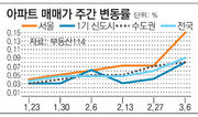 서울의 아파트 전세금이 37주 연속 고공행진을 이어가고 있다. 전세 물량이 부족한 지역을 중심으로 매매 전환 수요가 크게 늘며 매매 가격도 동반 상승하는 모양새다. 8일 부동산114에 따르면 지난주 서울의 아파트 매매 가격은 전주보다 0.15% 올랐다. 전주(0.07%) 대비 0.08%포인트 뛰며 상승폭도 커지고 있다. 구별로는 마포구(0.32%), 강동구(0.30%), 강남구(0.29%), 구로구(0.20%), 서초구(0.18%) 등이 많이 올랐다. 마포구는 아현뉴타운 내 공덕자이가 4월 입주를 앞두고 주변 아파트 값을 끌어올리면서 인근 마포래미안푸르지오의 경우 모든 평형대가 한 주 동안 1500만∼5000만 원 뛰었다. 서울의 아파트 전세금은 전주보다 0.38% 상승하며 9년 5개월 만에 가장 큰 폭으로 뛰었다. 주간 상승률 기준 역대 최고치인 2005년 10월 둘째 주(0.38%)와 같은 수준이다. 신도시와 수도권은 각각 0.19%, 0.14% 올랐다.홍수영 기자 gaea@donga.com}