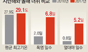 올해 여름이 역대급 폭염을 기록한 지난해 같은 기간과 비교해 훨씬 더운 것으로 나타났다. 기상청이 전국 45개 관측지점의 올여름(6월 1일∼7월 23일) 평균 최고기온을 계산한 결과 29.1도로 지난해 같은 기간 평균기온(27.9도)보다 1.2도나 높았다. 폭염과 열대야 일수 역시 부쩍 늘었다. 지난해 같은 기간 45개 지점의 평균 폭염(한낮기온 33도 이상일 때)일수는 2.0일이었던 반면 올해는 6.8일로 3배 이상으로 늘었다. 열대야도 심해져 지난해 0.8일에서 올해 5.2일로 무려 7배 가까이 됐다. 올해 장마가 늦어지면서 상대적으로 비 온 날이 적고, 일사량이 늘어났기 때문으로 풀이된다. 롤러코스터 장마가 지속되는 가운데 강우량의 양극화도 눈에 띈다. 올여름 총강우량은 지난해 같은 기간 대비 줄었지만, 청주 등 일부 지역은 시간당 90mm에 이르는 집중호우가 쏟아졌다. 특히 장마기간(6월 29일∼7월 14일) 홍천은 432.5mm의 비가 내린 반면 대구의 강우량은 13.1mm에 그쳐 지역별 강우량은 최대 33배나 차이가 났다. 기상청은 24일 올 8월 기온이 중부지방은 평년과 비슷하고 남부지방은 비슷하거나 높은 수준을 보일 것이라고 밝혔다.이미지 기자 image@donga.com}