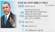 버락 오바마 미국 대통령은 21일 취임사에서 “모든 차이가 다 극복될 수는 없다. 그러나 ‘공통점(common ground)’을 찾기 위해 최선의 노력을 해야 한다”는 메시지를 던졌다.재선에 성공한 최초의 흑인 대통령으로서 미국 사회가 직면한 인종 계층 이념 갈등을 극복하는 데 최우선 순위를 두겠다고 천명한 것. 1기 취임 당시 68%에 이르는 경이적인 지지도와 비교했을 때 2기는 52%의 비교적 낮은 지지율로 출발하고 있지만 큰 격차로 재선에 성공한 오바마 대통령은 “국민은 나를 선택했다”라는 말을 자주 꺼내며 자신감을 보이고 있다.오바마 대통령은 이달 초 대통령 사학자들을 불러 2시간 반 동안 토론하면서 드와이트 아이젠하워 전 대통령을 2기 리더십의 롤 모델로 제시했다고 한다. 전후 미국 사회의 분열과 갈등을 수습하고 경제 번영의 토대를 닦은 아이젠하워 전 대통령은 2기 집권 때 더 빛을 발한 대통령으로 평가받는다. 전문가들은 오바마가 성공한 재선 대통령으로 역사에 남기 위해선 3개의 키워드를 명심해야 한다고 강조한다.우선 ‘어젠다’를 빨리 정립해야 한다. 오바마 대통령은 그 어느 대통령보다 어려운 환경에서 1기의 닻을 올렸지만 테러단체 알카에다를 이끄는 오사마 빈라덴을 사살하고 이라크-아프가니스탄전쟁을 종료하는 외교적 업적을 남겼다. 경기부양책 효과로 경제가 살아나고 있으며 획기적인 건강보험 개혁안도 시행할 예정이다.하지만 재선 대통령의 레임덕(권력누수 현상)은 1기 때보다 훨씬 빨리 찾아온다. 대개 재선 1년 뒤부터 통치력에 금이 가기 시작한다. 1기 때 경제와 외교에 치중한 오바마 대통령은 2기에는 총기규제 이민 환경 등 사회 이슈들을 정면 돌파할 것으로 전망된다. 통합의 리더십이 필요한 시기다.양극화로 치닫는 정치권을 조율할 ‘외교적 기술’도 필요하다. 상·하원을 민주당과 공화당이 양분한 현 의회 구조에서 초당적 협조란 쉽지 않다. 취임사에서 정치권이 ‘공통의 기반’을 찾아야 한다고 역설한 오바마 대통령이 대화와 소통을 위해 얼마나 손을 내밀지 주목된다.마지막으로 ‘위험(리스크)’을 감수해야 한다. 2008년 무명의 초선 상원의원으로 치열한 경쟁을 뚫고 민주당 대통령후보 자격을 획득한 뒤 여세를 몰아 최초의 흑인 대통령이 된 오바마의 정치적 여정은 도전의 연속이었다. 마틴 루서 킹 목사의 유산을 이어 미국이 직면한 정책적 도전을 과감히 국민 앞에 제시하고 헤쳐 나가야 한다.역사적으로 대다수 재선 대통령의 성적표는 그리 좋지 않았다.리처드 닉슨 전 대통령은 1972년 압도적인 표차로 재선에 성공했지만 워터게이트 스캔들로 물러났다. 로널드 레이건 전 대통령은 2기 동안 이란-콘트라 스캔들에 시달렸고, 빌 클린턴 전 대통령은 모니카 르윈스키 스캔들로 탄핵 위기까지 갔다. 조지 W 부시 전 대통령은 2기 취임 7개월 만에 닥친 허리케인 카트리나에 미숙하게 대응해 지도력에 타격을 입었다.오바마 대통령은 이런 전임자들을 의식한 듯 재선 직후 기자회견에서 제일성으로 “재선 대통령들이 거쳐 갔던 과욕의 오류에 빠지지 않겠다”고 밝혔다. 분열자가 아닌 상처를 보듬는 통합자로서 임무를 완수하겠다는 오바마 대통령을 가리켜 최근 미국에서 ‘치유 통수권자(Healer-in-Chief)’라는 단어가 회자되고 있다. 더이상 선거 부담이 없는 그가 어떤 치유책을 제시할지 기대와 관심이 쏠리고 있다.▼ 취임식 축하인파 70만명… 4년전 절반 ‘차분한 파티’ ▼■ 할리우드 스타들 총출동… 부시 前대통령 부자는 불참 버락 오바마 대통령의 2기 취임식이 열린 21일 이른 아침부터 미국 워싱턴 인근은 행사에 참석하려는 인파로 교통 전쟁이 벌어졌다. 오전 5, 6시부터 전철에는 외투, 귀마개, 목도리로 중무장한 승객들이 취임식을 주제로 이야기꽃을 피웠다. 취임식이 열리는 의사당 인근 ‘캐피털 사우스’역과 퍼레이드가 열리는 백악관 인근 역을 전철이 지날 때마다 승객들이 썰물같이 빠져나갔다. 전철역 바깥 행사장 입구에도 ‘좋은 자리’를 선점하기 위한 인파로 북적였다. 워싱턴 교통당국은 이날 취임식 인파에 대비해 전철 운행을 평소보다 1시간 이른 4시부터 시작해 두 시간 늦은 다음 날 오전 2시까지 연장했다.그래도 오바마 대통령의 2기 취임식은 4년 전 첫 취임식에 비해 차분한 분위기에서 치러졌다. 2009년에는 첫 흑인 대통령의 취임식을 보려고 160만여 명이 몰렸지만 21일 재선 취임식에는 50만∼70만 명의 인파가 몰린 것으로 취임식준비위원회는 추산했다.취임식장 주변은 마치 할리우드를 통째로 옮겨 놓은 것처럼 유명인이 대거 등장해 눈길을 끌었다. 취임식에서 비욘세, 켈리 클라크슨, 제임스 테일러가 미국 국가와 축가를 부른 것을 비롯해 케이티 페리, 어셔, 스티비 원더, 조지 로페즈 등 유명 연예인이 총출동했다.미국 대통령 취임식에는 전임 대통령들이 참석하는 것이 관례. 그러나 이날 취임식에 부시가(家)의 전임 대통령 2명이 모두 불참하고 지미 카터, 빌 클린턴 등 민주당 출신 전임 대통령만 참석해 오바마 대통령이 취임사에서 내놓은 통합의 메시지가 무색해졌다.조지 W 부시 전 대통령은 