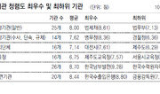 법무부와 경찰청이 공공기관 청렴도 평가에서 최하위를 기록했다. 국민권익위원회가 26일 공개한 ‘2012년 공공기관 청렴도 평가 결과’에 따르면 법무부는 10점 만점에 7.13점으로 일반 중앙행정기관 25개 중 가장 낮았다. 일반 중앙행정기관 중 청렴도가 가장 높은 곳은 법제처(8.61)였고 이어 여성가족부(8.57) 소방방재청(8.42) 순이었다. 수사, 단속, 규제를 담당하는 중앙행정기관 가운데에는 경찰청이 6.36점으로 최하위였고 검찰청이 6.81점으로 뒤를 이었다. 가장 높은 평가를 받은 곳은 병무청(8.36)이었다. 16개 시도교육청 가운데에서는 서울시교육청(5.57)이 가장 청렴도가 낮았다. 이번 평가는 권익위가 627개 공공기관을 대상으로 총 24만2897명의 민원인과 공공기관 내부 직원, 정책고객(학자, 언론인, 시민단체 관계자 등)을 설문조사한 결과를 바탕으로 한 것이다. 부패사건이 발생하거나 평가 과정에서 호의적인 대답을 유도하는 등 신뢰도 저해 행위가 드러날 경우 감점했다. 청렴도 전체 평균점수는 7.86점이다.장택동 기자 will71@donga.com}