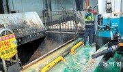 20일 오전 3시 반 부산 강서구 생곡음식물자원화시설. 부산시 산하 공공기관이 운영·관리하는 시설이다. 부산에는 하루 평균 739t의 음식물쓰레기가 발생하는데 이곳을 포함한 6곳의 민간·공공시설에서 나뉘어 처리된다. 기자는 이날 음식물쓰레기 수거업체의 작업에 동행했다. 5t 트럭에는 밤새 해운대구 재송동에서 수거해 온 음식물쓰레기가 가득 실려 있었다.○ 사다리 하나 없는 위험천만한 작업 환경 작업장 안으로 들어서자 더운 열기와 함께 코를 찌르는 역한 냄새가 진동을 했다. 어림잡아 가로세로 3m의 커다란 사각 저장고 4개가 땅속에 묻혀 있었다. 깊이는 대략 4∼5m 된다고 한다. 이날은 이 중 음식물쓰레기가 어느 정도 찬 저장고 2곳에서 처리 작업이 진행됐다. 반입된 음식물쓰레기가 처리되는 데는 30분 정도 걸렸다. 작업은 크게 3단계로 나뉘어 진행되는데 먼저 저장고에 넣기 전에 물기부터 최대한 빼낸다.차량 옆의 레버를 당기자 ‘웅’ 하는 굉음과 함께 음식물이 저장고로 밀려 내려갔다. 작업자들은 뒤처리 작업으로 차량 짐칸에 끼인 잔여물을 제거하려고 연신 호스로 물을 뿌려댔다. 트럭과 저장고 사이 공간이 1m 정도밖에 안 돼 작업을 지켜보는 내내 마음을 졸여야 했다. 자칫 발을 헛디뎠다가는 저장고로 추락할 것만 같았다. 기장군에서 발생한 사고도 이 과정이 문제였다고 한다. 쓰레기를 차에 싣는 일을 하는 김모 씨(60)는 “호스만으로 세척을 끝낼 수 있지만 오물이 안 떨어지면 빗자루나 삽으로 긁어내야 한다. 얼마 전에 일어난 사고도 삽으로 뒤처리하던 중에 미끄러져 발생한 것”이라고 설명했다.○ 안전대책은 ‘뒷짐’…뒤늦은 ‘대책’ 마련 이달 13일 음식물쓰레기 수거업체 직원이 저장고에 떨어져 숨진 기장군의 민간업체도 이곳과 작업환경이 비슷하다. 사고가 난 지 일주일이 지났지만 현장에는 안전대책 없이 위험한 작업은 계속되고 있었다. 추락 방지를 위해 몸에 고정하는 로프는 물론이고, 추락 때 구조를 위한 사다리도 보이지 않았다. 김 씨는 “추락 때 잡고 나올 수 있는 밧줄 하나만 있어도 좋겠다. 6곳의 처리업체에 이런 구호장비가 설치된 곳은 예전에도, 지금도 없다”고 지적했다. 트럭 운전사 이모 씨(37)는 “안전난간을 설치하면 사고를 막을 수 있다. 사방이 난간으로 된 별도 발판에 올라 뒤처리를 하면 저장고에 떨어질 일은 없을 것”이라고 말했다. 부산시는 뒤늦게 대책 마련에 나섰다. 시 관계자는 “사다리와 로프 등 안전장치를 설치할 것을 각 처리업체 등에 지시했다. 근본 대책도 찾겠다”고 밝혔다. 정영주 부산노동권익센터 사무국장은 “청소 노동자가 생명을 걸고 생업에 뛰어드는 일은 없어져야 한다”며 “사고 때 빠르게 구출할 수 있는 시스템 마련이 시급하다”고 지적했다.부산=김화영 기자 run@donga.com}
