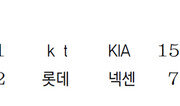 KIA가 7경기 연속 두 자릿수 득점을 올리며 한미일 프로야구 역대 최다 기록을 썼다. KIA는 4일 문학 SK전에서 4회초에 10점째를 뽑아내며 대기록을 작성했다. 2일 LG전에서 6경기 연속 두 자릿수 득점을 올려 미국 메이저리그 기록(6경기)과 타이를 이룬 KIA는 이날 다시 금자탑을 쌓았다. 메이저리그 기록은 뉴욕(현 샌프란시스코) 자이언츠가 1929년 6월 19일부터 22일까지(더블헤더 4경기 포함) 세웠다. 일본프로야구(NPB) 최다 기록은 4경기다. KIA 타선은 올 시즌 10승 3패를 거두고 최근 9연승 중이던 SK의 에이스 메릴 켈리를 1회부터 두들겼다. 1, 2회 9점을 뽑아낸 KIA는 4회초 나지완의 1타점 2루타로 대기록을 작성했다. KIA는 SK를 15-6으로 꺾고 7연승을 거두며 선두를 질주했다. KIA 선발 헥터 노에시는 6이닝 동안 4실점했지만 승리 투수가 되며 올 시즌 13승 무패를 기록했다. 헥터는 지난해 10월 2일 kt전부터 14연승을 이어가며 2014년 앤디 밴헤켄(넥센)이 세운 역대 외국인 선수 최다 연승 기록과 타이를 이뤘다. 한편 최근 고위 인사가 심판과 돈거래를 한 사실이 밝혀져 파문을 일으킨 두산은 kt 경기에 앞서 신임 전풍 대표이사를 비롯해 프런트 전 직원이 그라운드로 나와 팬들에게 사과했다. 유재영 기자 elegant@donga.com}