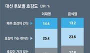 더불어민주당 이재명 후보와 국민의힘 윤석열 후보 모두 비호감도가 과반을 넘으면서 내년 대선이 유례없는 ‘비호감 대선’이 될 수 있다는 우려가 수치로도 드러났다. 1일 채널A 여론조사에 따르면 이 후보의 비호감도는 51.4%, 윤 후보의 비호감도는 51.3%로 두 후보가 비슷한 수치를 기록했다. 이 후보의 경우 60세 이상에서 60.9%로 비호감도가 가장 높았고, 이어 20대(55.3%)와 30대(51.2%) 순이었다. 호감도는 40대(60.6%)가 가장 높았다. 이 후보가 비호감인 이유로는 ‘인물, 능력, 도덕성 때문에’(67.8%)라는 응답이 제일 많았다. 윤 후보는 3040세대에서 비호감도가 높았다. 40대의 69.5%가, 30대의 59.4%가 각각 윤 후보가 비호감이라고 응답했다. 윤 후보 역시 ‘인물, 능력, 도덕성 때문에’(58.2%) 비호감이라는 답변이 가장 많았고, ‘정치경력 때문에’라는 응답도 21.4% 나왔다. 두 후보 외에 국민의당 안철수 후보도 비호감도가 56.9%로 5명의 후보 중 가장 높은 것으로 나타났다. 이번 조사에서 후보 배우자의 호감도가 대선 후보 선택 시 영향을 미친다는 응답이 55%로 나타났다. 후보 배우자에 대한 인식이 최종 투표에 적잖은 영향을 미칠 수도 있다는 것. 조사에서 이 후보의 부인 김혜경 씨의 호감도와 비호감도는 각각 32.2%와 38.7%로 집계됐다. 윤 후보의 부인 김건희 씨는 호감도 14.9%, 비호감도 56.7%로 비호감도가 41.8%포인트 더 높은 것으로 나타났다. 허동준 기자 hungry@donga.com}