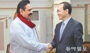 스리랑카를 방문 중인 새누리당 성완종 의원(오른쪽)이 29일 콜롬보 대통령궁에서 마힌다 라자팍사 대통령과 만나 악수하고 있다. 성 의원은 라자팍사 대통령과의 단독 면담에서 스리랑카가 추진 중인 경제개발 계획을 포함해 자원개발 및 도로 항만 건설 등 양국 간 경제협력 강화 방안에 대해 의견을 나눴다. 성 의원은 경남기업 회장으로 스리랑카 경제발전을 지원하며 라자팍사 대통령과 각별한 인연을 맺어 왔다. 성완종 의원실 제공}