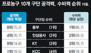 동부가 ‘철옹성’ 같은 막강한 수비력을 앞세워 14일 역대 최소인 47경기 만에 40승을 거두고 정규시즌 1위를 확정하면서 ‘수비 농구의 힘’이 다시 한 번 주목을 받고 있다. 동부는 15일 현재 평균 실점 66.7점으로 수비력 1위에 올라 있다. 7경기가 남은 동부가 프로농구 출범 후 처음으로 정규시즌 평균 실점을 60점대에서 막아낼 수 있을지가 관심거리다. 역대 한 시즌 최소 평균 실점은 지난 시즌에 동부가 작성한 70.1점이다. 강동희 동부 감독은 “중고교나 대학 농구라면 몰라도 프로까지 진출한 선수들의 공격 능력을 더 키우는 데는 한계가 있다. 결국 수비로 승부를 걸 수밖에 없다. 그리고 프로리그에서는 상·하위 팀 간 공격력은 크게 차이가 나지 않는다”고 말했다.강 감독의 말대로 공격력보다는 수비력이 팀 순위에 미치는 영향이 더 크다. 대표적인 예가 동부다. 동부는 공격력이 총 10개 구단 중 8위로 하위권이지만 다른 팀들을 압도하는 수비를 앞세워 이번 시즌 한 번도 선두 자리를 내준 적이 없다. 수비력 2, 3위인 인삼공사와 KT는 팀 순위에서도 그대로 2, 3위다. KT는 공격력이 9위에 불과하다. 결국 상위권인 1∼3위는 수비 능력대로 순위가 매겨진 셈이다. 수비력이 중위권(4∼6위)이면 팀 성적도 중위권이고 수비력이 하위권(7∼10위)이면 팀 순위도 하위권이다. LG는 공격력이 전체 2위지만 수비(9위)가 안돼 팀 순위는 7위에 머물렀다. 반면 전자랜드는 공격력은 꼴찌 팀이지만 수비(4위)의 힘으로 버텨 5위를 유지하고 있다. “공격력은 들쭉날쭉할 때가 있지만 수비는 그렇지 않다”는 강 감독의 말 그대로다.수비는 공격에 비해 잘하는 팀과 못하는 팀의 격차가 뚜렷하다. 공격력 1위인 KCC와 최하위인 전자랜드는 평균 득점에서 5.5점밖에 차이가 나지 않는다. 이에 비해 수비력 1위 동부와 꼴찌인 삼성의 평균 실점은 16.7점이나 차이가 난다. 공격은 잘하는 팀이나 못하는 팀이나 별 차이가 없지만 수비는 격차가 확연히 드러나기 때문에 팀 성적으로 이어질 수밖에 없다.일부에선 수비 농구가 재미를 떨어뜨린다는 지적도 있다. 하지만 이번 시즌을 포함해 최근 10시즌 동안 수비력 1위 팀이 정규시즌 정상을 차지한 게 8차례나 될 만큼 국내 프로농구에서는 수비 농구가 갈수록 위력을 떨치고 있다.이종석 기자 wing@donga.com}