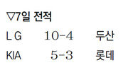 LG가 서울 라이벌 두산과의 3연전을 쓸어 담았다. LG는 7일 잠실야구장에서 벌어진 두산과의 경기에서 10-4로 승리했다. LG가 두산과의 3연전을 모두 이긴 것은 2012년 5월 18일에서 20일 3연전을 싹쓸이한 후 처음이다. LG 박용택은 2회초 2타점 3루타로 포문을 연 데 이어 6회초 2타점 적시타로 두산 선발 유희관을 무너뜨렸다. 올 시즌 처음으로 1번 타자로 출전한 박용택은 6타점을 쓸어 담으며 자신의 한 경기 최다 타점 기록을 세웠다. LG 선발 투수 류제국은 5.1이닝을 3실점으로 막고 시즌 6승째를 거두며 다승 공동 선두에 올라섰다. 선두 KIA도 롯데와의 3연전을 모두 이겼다. KIA는 8회초 2-3으로 뒤진 상황에서 이범호의 적시타와 서동욱의 2점 홈런으로 역전에 성공하며 5-3으로 승부를 마무리했다. NC는 삼성을 13-3으로 꺾었다. NC 나성범은 1회말 1점 홈런을 터뜨리며 개인 통산 100홈런 기록을 썼다. kt는 한화를 10-0으로 꺾고 3연패에서 벗어났다. 지난달 29일 LG전에서 완봉승을 거뒀던 kt 투수 고영표는 이날 선발로 등판해 6이닝 동안 3안타 6삼진 무실점 호투를 펼치며 시즌 3승째를 챙겼다. SK와 넥센은 6-6으로 승부를 가리지 못했다. 유재영 기자 elegant@donga.com}