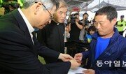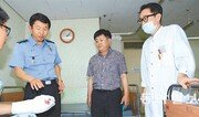 김석균 해양경찰청장(왼쪽에서 두 번째)이 9일 세월호 사고해역에서 수색을 돕던 중 부상한 제주해경 소속 장모 상경(왼쪽)을 방문해 위로하고 있다. 장 상경은 7일 세월호 현장에서 해경 경비정에 접근하던 도중 선체 사이에 손가락이 끼어 절단됐다. 박영철 기자 skyblue@donga.com}