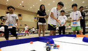 방학 중인 학생들이 로봇을 통하여 창의력과 과학적 사고력을 배양하는 2014 빛고을 로봇페스티벌이 16일 열렸다. 로봇경연대회에 참가한 학생들이 직접 조립한 로봇으로 축구 경기를 펼치고 있다. 박영철 기자 skyblue@donga.com}